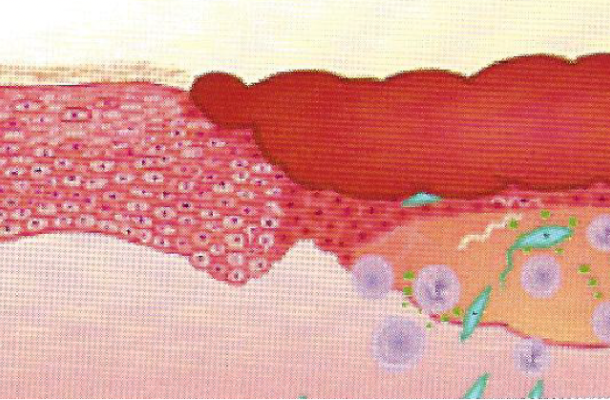 혈소판이 엉겨붙어 출혈을 막는 지혈작용과 백혈구 등 염증세포가 모여들어 외부에서 침입한 균과 죽은 조직을 제거하는 과정